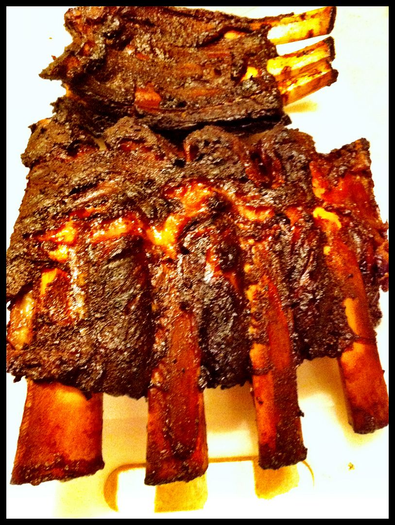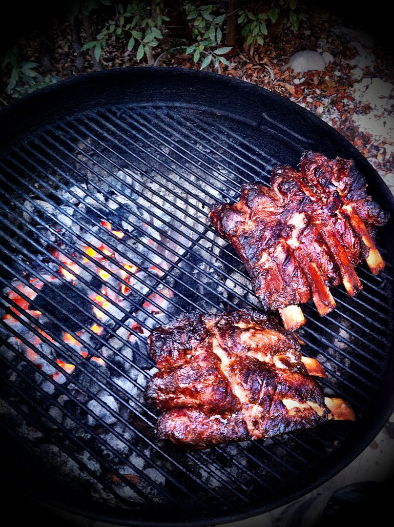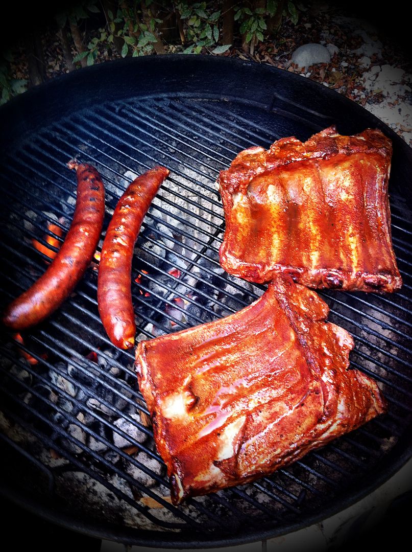 5lbs of coals on one side of the gril, sum Red oak pieces from the wood pile and a few apple wood chips...then place the ribs on the other side of the grill and cover....open every 45min to spray with beer... 2.5 hrs start to finish. So Good!
