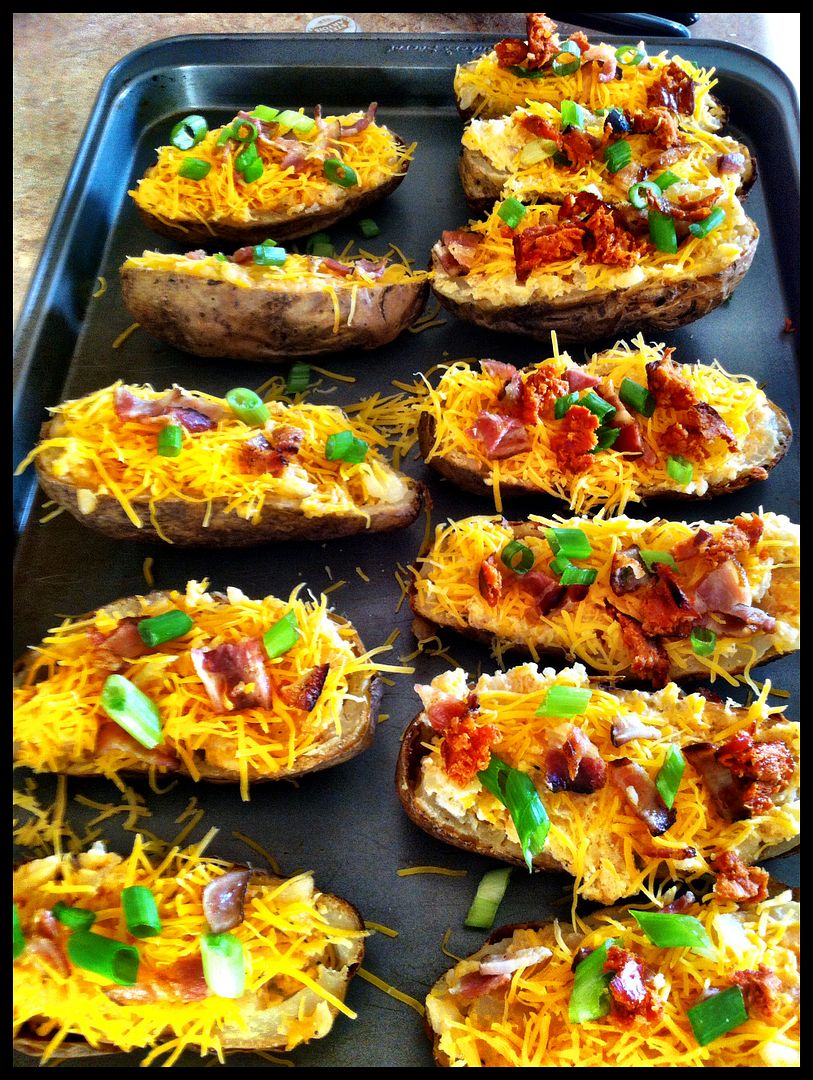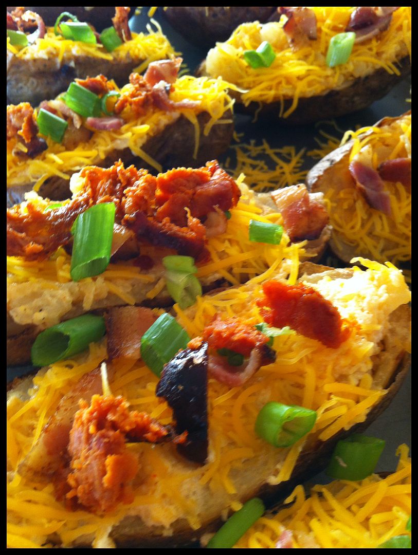 For the Twice baked I bake the tato's the first time and let them cool...scoop out the insides with out damaging the Skin, put all the scooped out potato into a bowl with mayo, Valentina, cayenne, salt n pepper. mix up...then mix in some shredded cheese....add mixture back to the skins and top with Green onion, Bacon, Lincuica and more cheese...bake at 400 for 10-15 till the cheese melts and gets a little brown.